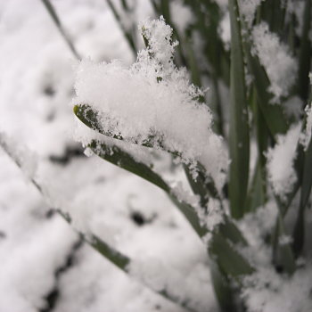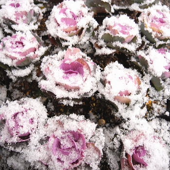 と、ビニールハウスの中は春爛漫な感じですが、外に置いてあった葉牡丹はいつの間にか大降りになった雪のせいでこんな感じになってました。