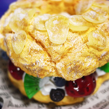 シュー生地の間にブルーベリー、イチゴ、キウイ。